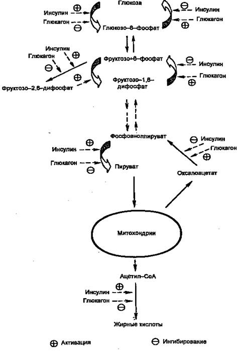 Как видно из рисунка, при смене режимов многие процессы меняют направление на противоположное. За каждой из стрелок — серия реакций; ферменты, катализирующие ключевые реакции (лимитирующие скорость данной метаболической цепи), находятся под контролем многих регулирующих механизмов, включающих в качестве первого (внеклеточного) вестника сигнала главным образом инсулин и глюкагон, а также адреналин и кортизол.