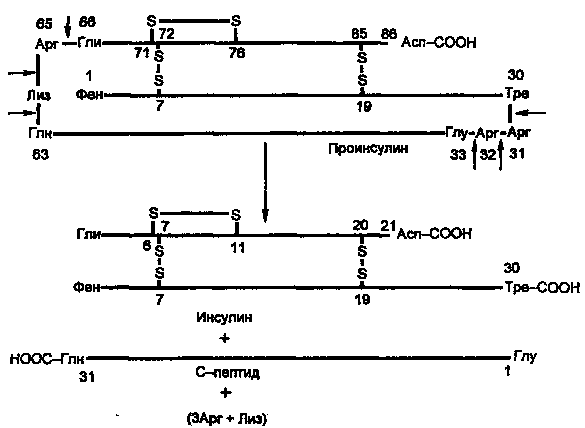 Синтез препроинсулина происходит на полирибосомах, связанных с эндоплазматическим ретикулумом. Препроинсулин проникает в люмен ретикулума, где от него отщепляется лидирующая последовательность — N-концевой фрагмент, содержащий 24 аминокислотных остатка. Образовавшийся проинсулин (86 аминокислотных остатков) перемещается затем в аппарат Гольджи, где упаковывается в секреторные гранулы. В аппарате Гольджи и секреторных гранулах происходит превращение проинсулина в инсулин. В этом превращении участвуют две эндопептидазы: прогормонконвертазы 2 и 3 (ПГ2 и ПГЗ; последнюю называют также ПГ1). Эти ферменты расщепляют связи Арг32—Глу33 и Арг65—Гли66. Затем С-концевые остатки Apr и Лиз отщепляются карбоксипептидазой Е (КП-Е; известна также как КП-Н). Этот фермент есть во многих других органах, участвует в процессинге ряда гормонов и нейромедиаторов.