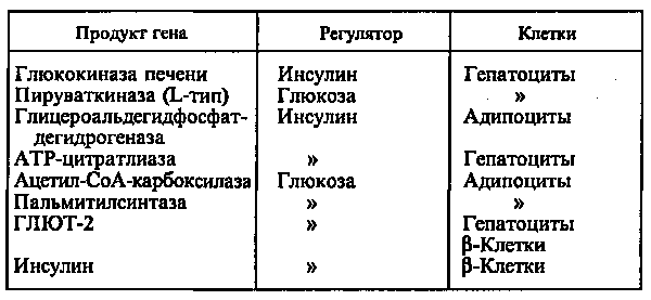 Действие глюкозы может быть прямым, когда сама глюкоза или ее метаболиты непосредственно взаимодействуют с аппаратом регуляции гена, или вторичным, обусловленным влиянием глюкозы на секрецию гормонов, главным образом инсулина и глюкагона. Однако выяснить, что является регулятором — инсулин или глюкоза, можно только при использовании клеточных культур, позволяющих строго контролировать содержание этих веществ в среде (см. табл.).