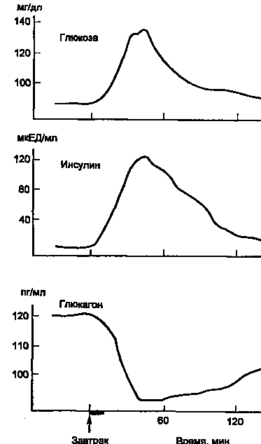 Рисунок 5. Изменение концентрации в крови глюкозы, инсулина и глюкагона после приема пищи (1 ЕД инсулина содержит 0,4081 мг белка инсулина).