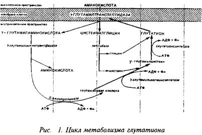 Еще один своеобразный механизм транспорта аминокислот связан с метаболизмом широко распространенного во всех тканях, в том числе и в нервной, трипептида глутатиона, цикл синтеза и деградации которого известен под названием у-глутамильного цикла. Наиболее интересным и ключевым ферментом этого цикла является у-глуталшлтранспептидаза, прочно связанная с клеточной мембраной. Этот энзим способен переносить у-глутамильную группу глутатиона, находящегося внутри клетки, на аминокислоту, локализованную с наружной стороны мембраны, и переносить образующийся дипептид внутрь клетки. Следующий фермент этого цикла - у-глутамилциклотрансфераза высвобождает аминокислоту. Таким образом, у-глутамил транспептидазная реакция является одним из механизмов транспорта аминокислот внутрь клетки.