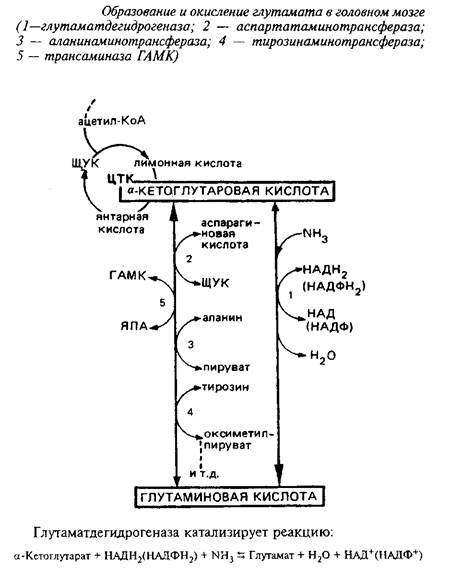 Непосредственным предшественником для синтеза глутамата в мозге является а-кетоглутаровая кислота, которая может превращаться в глутамат или путем прямого восстановительного аминирования с участием глутаматдегидрогеназы, или путем переаминирования.