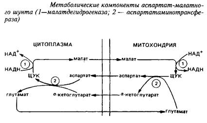 Уже упоминалось, что различные органеллы клеток мозга могут индивидуально контролировать уровни аминокислот, накапливая их против градиента концентрации. Примером этого могут служить изолированные из ЦНС митохондрии, которые быстро поглощают глутамат и малат, освобождая соответствующие количества аспартата и а-кетоглутарата. Это означает, что ток аспартата через митохондриальную мембрану связан с током глутамата в обратном направлении; также реципрокно связаны ток малата и а-кетоглутарата. Энзимы, катализирующие отдельные реакции малат-аспартатного шунта, превалируют в тканях ЦНС. В нейронах малат-аспартатный шунт является преобладающим механизмом переноса восстановительных эквивалентов в митохондрии.