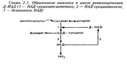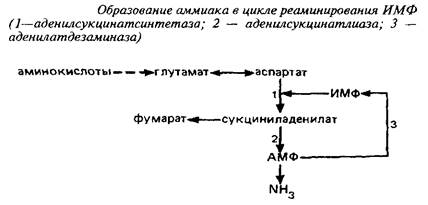 Вне митохондрий действует другой циклический процесс образования аммиака, в котором аспартат реаминирует инозинмонофосфат.