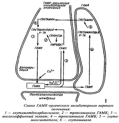 Метаболическая компартментализация аминокислот, в частности аминокислот глутаминовой группы, особенно ярко проявляется в субклеточной локализации ферментов в ГАМК-ергическом нейроне и в астроцитах. Так, пируваткар-боксилаза локализована преимущественно в астроцитах, в то время как пируватдегидрогеназный комплекс более активен в нейронах, чем в астроцитах. Преимущественная локализация пируватдегидрогеназы в нейронах ответственна в конечном счете за низкое включение углерода глюкозы, лактата и глицерина в глутамин. Глутамин-синтетаза преимущественно локализована в астроцитах, а глутаминаза - в нейронах. Глутамат, поглощаясь астроцитами, превращается в глутамин в глутамин-синтетазной реакции. Глутамин, выйдя из астроцитов и входя в нейроны, образует глутамат и далее ГАМК. Таким образом, глутамин и ГАМК осуществляют коммуникацию между большим и малым метаболическими компартментами.