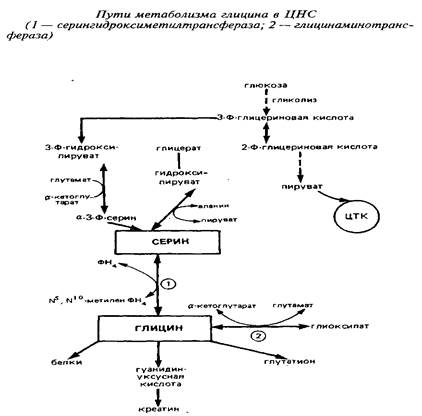 Так как потребление глицина в нервной ткани относительно велико, а поступление его из крови происходит медленно, значительная часть глицина синтезируется в мозге de novo. Глюкоза и серии являются главными источниками глицина в ЦНС. Серии может образовываться из глюкозы через 3-фосфоглице-риновую кислоту. Кроме того, серии сравнительно быстро поступает из циркулирующей крови. Синтез глицина de novo происходит в нервной ткани из серина путем обратимой N, W-метилентетрагидрофолат-тет-рагидрофолатзависимой трансформации при участии фермента серингидроксил1етилтрансферазы. Реакция катализируется серингидроксиметилтрансферазой и протекает следующим образом: