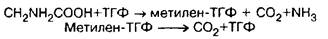 При участии глицин-расщепляющей системы глицин распадается на метилентетрагидрофолат, диоксид углерода и аммиак, затем происходит окисление метилен-ТГФ с образованием СОз - окончательного продукта распада глицина.