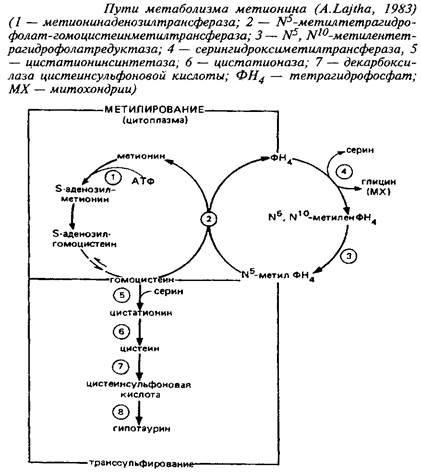 Процессам метилирования отводится важная роль: в проведении сигнала через мембрану, в регулировании жидкостно-сти мембраны и, наконец, в процессах метилирования ДНК. Последние считают вероятными участниками механизмов долговременной памяти. В то время как первая половина цикла превращения метионина связана главным образом с метилированием, вторая часть его ассоциирована в основном с нейротрансмиттерной и нейромо-дуляторной функцией. Оказалось, что 20% серусодержащих аминокислот локализовано в синаптосомах.
