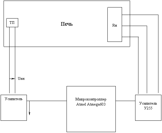 Температура в объекте регулирования (печи) измеряется с помощью термопары. Термопара преобразует температуру в напряжение, которое подается на усилитель. Выходной сигнал с усилителя подается на АЦП. Микроконтроллер Atmel ATmega 603