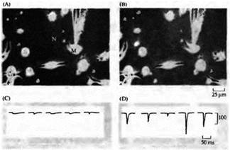 Рис. Быстрое образование действующих синаптических связей между аксонами мотонейронов и мышечными клетками. (А, В) Фазово-контрастные фотографии растущих нервных отростков (N) и веретеновидных миоцитов (М) в нервно-мышечной культуре клеток Xenopus в начале (А) и в конце (В) электрической регистрации. (С, D) Whole-cell patch-clamp миоцитов. Можно зарегистрировать спонтанные синаптические токи уже через Î минуту после контакта (С), которые увеличиваются на несколько порядков к 18-й минуте (D). |