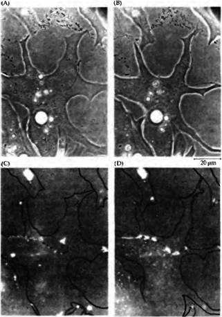 Рис. 4. Аксоны вызывают агрегацию рецепторов ацетилхолина в областях контакта с мышечными клетками. Фазово контрастные (A. В) и флуоресцентные (С, D) микрофотографии нервно-мышечной культуры клеток Xenopus. Рецепторы ацетилхолина окрашены при помощи родамин бунгаротоксина. (А, С) До и сразу после контакта на миоците имеются спонтанно образованные кластеры рецепторов АХ. (В, D) Через 24 ч спонтанно образовавшиеся области рецепторов АХ исчезли и образовались новые области непосредственно в области аксонального контакта. |