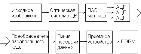 Рассмотрим схему работы комплекса видео наблюдения (рисунок 1). Исходное изображение проецируется оптической системой на прибор с зарядовой связью (ПЗС), который осуществляет преобразование световой энергии в зарядовые пакеты, хранение зарядовых пакетов и их передачу на выход устройства. Зарядовые пакеты основных трех цветов поступают на входы 8 битных аналого-цифровых преобразователей. Цифровые сигналы поступают на вход преобразователя параллельного кода, который и формирует последовательный код, передаваемый по линии передачи данных в приемное устройство, подготавливающие данные к передаче в ПЭВМ.