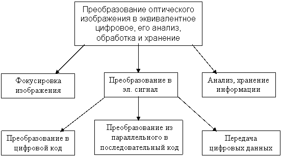 Для решения задачи видео наблюдения, система должна уметь выполнять следующие функции: фокусировка и преобразование оптического изображения в электрический сигнал, преобразование полученного сигнала в цифровой и доставка его устройству обработки и хранения. Схема разбиения системы по функциям представлена на рисунке 2.