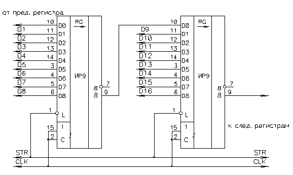 Так как количество разрядов данных, которые необходимо обработать превосходит разрядность одной микросхемы регистра, необходимо объединить их в каскады в соответствии с приведенной схемой на рисунке 7. Таким образом обеспечивается требуемая разрядность.