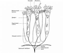 Рис. 2. Схематическое изображение обонятельной сенсорной. Три сенсорные клетки окружены опорными клетками