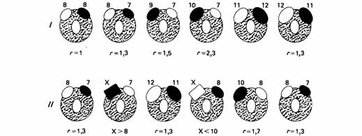 Рис. 20. Количественный метод оценки поддельного яйца. Кружком обозначено гнездо с одним яйцом внутри него и двумя поддельными яйцами на краю. Числа 7, 8, 9, 10, 11, 12 выражают величину поддельных яиц, r -отношение величин поддельных яиц на краю гнезда. X - модель, подлежащая измерению. Поддельное яйцо, выбранное для каждой пробы, обозначено черным цветом.