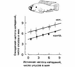 Рис. 22. Ожидаемая частота нападений самцов цикловых рыб в зависимости от предшествующей частоты. Эти данные показывают, что по сравнению с контрольной ситуацией предъявление искусственной рыбы-соперника оказывает аддитивное действие на частоту нападений