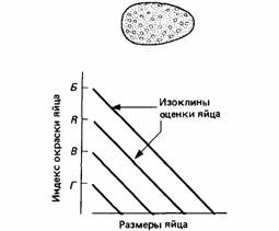 Рис. 24. Пространство признаков для оценки яйца. Параллельные изоклины показывают, что окраска и размеры яйца аддитивны по своему действию и могли бы быть представлены одним индексом оценки яйца.