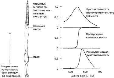У многих птиц и рептилий обнаружено больше трех типов цветовых рецепторов. Кроме различных фотопигментов, колбочки этих животных часто содержат окрашенные капельки масла, которые действуют как фильтры и в сочетании с фотопигментом определяют спектральную чувствительность рецептора. Эти капельки обычно не распределены по сетчатке равномерно, а сосредоточены в определенных ее частях.