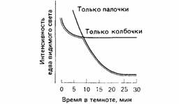 Рис. 14. График, показывающий, как интенсивность едва видимой короткой вспышки снижается по мере адптации к темноте. Крутая одиночная линия показывает, что происходит, когда сетчатка содержит только палочки. Пологая одиночная линия показываем. что происходит, когда освещены только колбочки.