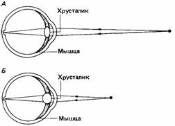 Рис. 15. Фокусировка глаза. Хрусталик уплощается при рассматривании дальних предметов и становится более выпуклым при рассматривании предметов вблизи.