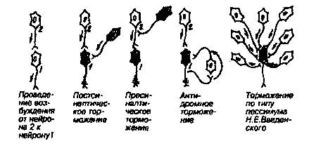 Если рассмотреть «архитектуру» использования тормозных нейронов при организации нейронных сетей, цепей и рефлекторных дуг, то можно выделить ряд вариантов этой организации (это отражается в названии данного вида торможения).