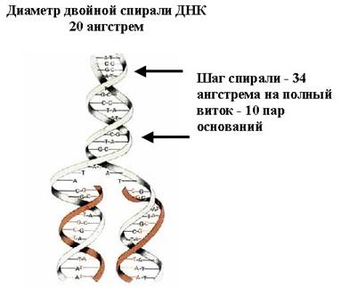 Здесь также указан один из параметров ДНК, это шаг спирали, на каждый полный виток приходится 10 пар оснований, заметим, что один шаг – это не между ближайшими выступами, а через один, так как у ДНК есть малая бороздка и большая. Через большую бороздку с ДНК взаимодействуют белки, которые распознают последовательность нуклеотидов. Шаг спирали равен 34 ангстрем, а диаметр двойной спирали – 20 ангстрем.