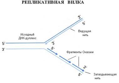 Репликацию ДНК осуществляет фермент ДНК-полимераза. Этот фермент способен наращивать ДНК только на 3΄– конце. Вы помните, что молекула ДНК антипараллельна, разные ее концы называются 3΄-конец и 5΄ - конец. При синтезе новых копий на каждой нити одна новая нить удлиняется в направлении от 5΄ к 3΄ , а другая – в направлении от 3΄ к 5-концу. Однако 5΄ конец ДНК-полимераза наращивать не может. Поэтому синтез одной нити ДНК, той, которая растет в "удобном" для фермента направлении, идет непрерывно (она называется лидирующая или ведущая нить), а синтез другой нити осуществляется короткими фрагментами (они называются фрагментами Оказаки в честь ученого, который их описал). Потом эти фрагменты сшиваются, и такая нить называется запаздывающей, в целом репликация этой нити идет медленней. Структура, которая образуется во время репликации, называется репликативной вилкой.