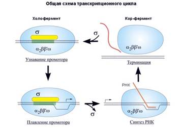 Связавшись с ДНК, а именно с промотором, который распознала σ-субъединица, холофермент расплетает двунитевую спираль и начинает синтез РНК. Участок расплетенной ДНК – это точка инициации транскрипции, первый нуклеотид, к которому должен комплементарно быть присоединен рибонуклеотид. Инициируется транскрипция, σ-субъединица уходит, а кор-фермент продолжает элонгацию цепи РНК. Затем происходит терминация, кор-фермент освобождается и становится готов к новому циклу синтеза.