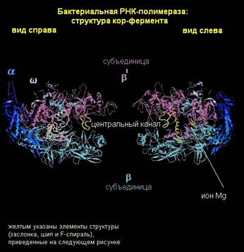 Разберем более подробно молекулярную структуру кор-фермента. Как было сказано выше, кор-фермент состоит из α- и β-субъединиц. Они соединены так, что образуют как бы «пасть» или «клешню». α-субъединицы находятся в основании этой «клешни», и выполняют структурную функцию. С ДНК и РНК они, по-видимому, не взаимодействуют. ω-субъединица – небольшой белок, который также выполняет структурную функцию. Основная часть работы приходится на долю β- и β΄-субъединиц. На рисунке β΄-субъединица показана наверху, а β-субъединица - внизу.