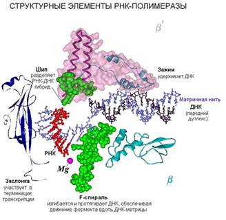 В транслокации, то есть перемещении РНК-полимеразы по нити ДНК, участвует α-спиральная структура, снизу вверх торчащая из β-субъединицы.