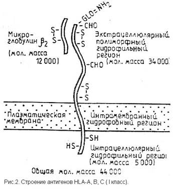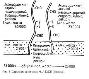 Антигены I класса явяются мембранными гликопротеинами, состоящими из двух частей: глигозилированной полипептидной тяжелой цепи (см.рис.2) с молекулярной массой 44000 и b2-микроглобулина с молекулярной массой 12000. Молекулы HLA II класса также являются гликопротеинами (см. рис.3), но состоят из двух нековалентно соединенных цепей a и b с молекулярной массой 34000 и 29000 соответственно. [3]