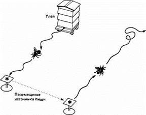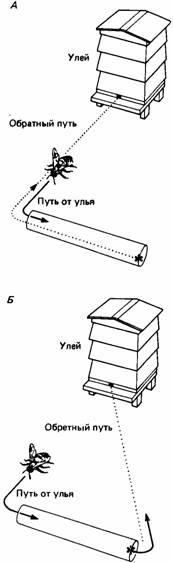 Рис. 3. Эксперименты Линдауера, в которых изучались энергетические затраты пчелы во время полета от улья к источнику пищи. На рис. А пчела проделывает длинный обратный путь, на рис. Б - короткий. В обоих случаях путь от улья к пище один и тот же, и когда пчела возвращается в улей, она сообщает об этом посредством танца.