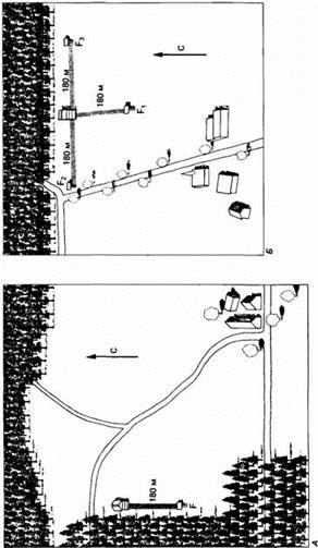 Рис. 4. Эксперименты для выяснения роли линейных ориентиров при ориентации пчел. А. Пчелы были приучены летать к столику с пищей F вдоль идущего с севера на юг края сосновой рощи, Б. После этого пчел тестировали вблизи опушки, идущей в востока на запад, где им предлагали на выбор три столика с пищей f1, F2 и F3. Большинство пчел выбирали путь в направлении восток-запад, вдоль опушки леса, хотя они были приучены летать в направлении север-юг.