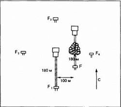Рис.5. Пчел приучили летать мимо дерева к столику с пищей F. Когда улей перенесли к западу от дерева, пчелы не обращали внимания на дерево и летели на юг.