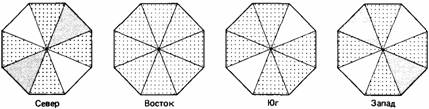 Рис.7. Четыре различные картины распределения яркости, которые можно видеть в одно и то же время дня, если разглядывать разные участки неба через восьмиугольный фильтр, составленный из восьми кусков поляроида. Плотность серого тона соответствует яркости свечения.