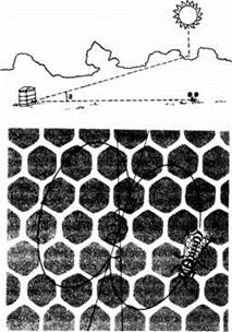 Рис.10. Виляющий танец медоносной пчелы. Угол между осью танца и вертикалью соответствует угловому расстоянию между источником пищи и солнцем.