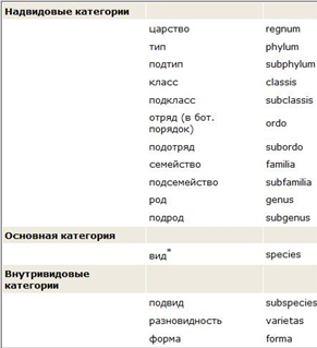 Наука о классификации животных и растений носит название таксономии, она определяет родственные связи между организмами. Основателем научной систематики был шведский ботаник Карл Линней, который ввел (1753) так называемую биномиальную номенклатуру, позволяющую с максимальной точностью определить положение любого животного или растения в системе. Согласно этой номенклатуре каждый вид получает двойное название: родовое и видовое. Все названия пишутся на латинском языке. Родовое имя пишется с большой буквы, видовое - с малой. Степень сходства между организмами, входящими в одну таксономическую категорию, возрастает по мере перехода к категориям более низкого ранга. Применяются следующие таксономические категории: