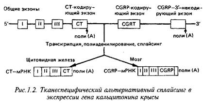 Альтернативный процессинг заключается в образовании различных зрелых мРНК из одного первичного транскрипта в результате соединения различных комбинаций экзонов и/или использования различных сигналов полиаденилирования. Одним из наиболее хорошо изученных случаев использования альтернативного сплайсинга для образования различных продуктов в разных клетках является система синтеза регуляторных пептидов, кодируемых геном кальцитонина. Этот ген кодирует небольшое семейство пептидов, два из которых (кальцитонин и катакальцин) преимущественно образуются в клетках щитовидной железы, а третий - в клетках нервной системы.