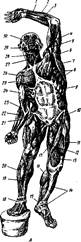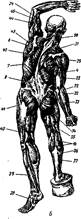 / — длинная ладонная мышца, 2 — сгибатель пальцев, 3, 21 — сгибатели кисти, 4, 44 — трехглавая мышца плеча, 5 — клювоплечевая мышца, 6 — большая круговая мышца, 7 — широкая мышца спины, 8 — передняя зубчатая мышца, 9 —наружная косая мышца живота, 10 — подвздошно-поясничная мышца, // — прямая мышца бедра, 12 — портняжная мышца, 13 — внутренняя широкая мышца, 14, 19 — передняя большеберцовая мышца, 15— пяточное сухожилие, 16 — икроножная мышца, 17—нежная мышца, 18 — крестообразная связка, 20—малоберцовые мышцы, 22 — плечелучевая мышца, 23, 24 — двуглавая мышца плеча, 25 — дельтовидная мышца, 26 — большая грудная мышца, 27 — грудино-подъязычная мышца, 28 — грудино-ключично-сосцевидная мышца, 29 — жевательная мышца, 30 — круговая мышца глаза, 31 — трапециевидная мышца, 32 — разгибатель кисти, 33, 38 — разгибатель пальцев, 34 — большая ягодичная мышца, 35 — двуглавая мышца бедра, 36—камбаловидная мышца. 37, 39 — длинная малоберцовая мышца, 40, 41 — широкая фасция бедра, 42 — ромбовидная мышца, 43 — подостная мышца, 45 — плечевая мышца