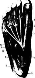 1 — сухожилие мышцы — длинного сгибателя большого пальца стопы; 2 — червеобразные мышцы; 3 — мышца — короткий сгибатель большого пальца стопы; 4 — мышца, отводящая большой палец стопы; 5 — подошвенный апоневроз (отрезан); 6 — мышца — короткий сгибатель пальцев стопы (отрезана); 7 — квадратная мышца подошвы; 8 — сухожилие мышцы — длинного сгибателя пальцев стопы; 9 — мышца — сгибатель мизинца стопы; 10 — мышца, отводящая мизинец стопы.
