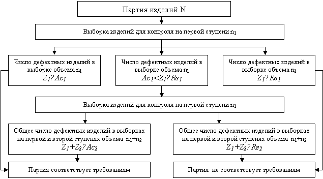 При плане двухступенчатого контроля число контролируемых изделий равно объему первой выборки, указанному в плане. Если число дефектных изделий, обнаруженных в первой выборке, равно или меньше первого приемочного числа Ac1, партия принимается. Если число дефектных изделий, обнаруженных в первой выборке, равно или превышает первое браковочное число Re1, партия бракуется. Если число дефектных изделий, обнаруженных в первой выборке, находится между первым приемочным и браковочным числами, контролю подлежит вторая выборка, указанная в плане контроля. Числа дефектных изделий, обнаруженные в первой и второй выборках суммируются. Если суммарное число дефектных изделий равно или меньше второго приемочного числа Ac2, партия принимается. Если суммарное число дефектных изделий равно или превышает второе браковочное число Re2, партия бракуется. На рисунке 3 показан ход действия двухступенчатых планов контроля.