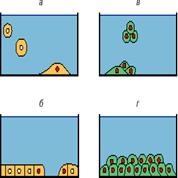 Рис. 3. Регуляция размножения клеток в культуре. Жидкая среда синяя, стенки и дно сосуда черные. У неразмножающихся клеток ядра не окрашены, у клеток в митотическом цикле красные: а, б - нормальные клетки: а - зависимость размножения клетки от подложки: вступила в цикл лишь клетка, прикрепившаяся к поверхности дна сосуда (подложке), но не клетки, взвешенные в жидкой среде, б - зависимость размножения от плотности населения культуры. Среди клеток, прикрепленных к подложке, размножаются лишь те, которые граничат со свободной поверхностью этой подложки, но не клетки, окруженные со всех сторон соседями; в, г - опухолевые клетки размножаются без подложки в жидкой среде (в) и на подложке независимо от числа соседей