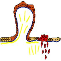 Рис. 4. Два опухолевых клона среди клеток нормального эпителия. Нормальные клетки светло-коричневые. Клетки клона, образующего доброкачественную опухоль - полип (темно-коричневый цвет), дают избыточный рост и образуют выпячивание над поверхностью пласта, но не проникают в соединительную ткань под эпителием. Напротив, клетки злокачественного (ракового) клона (красный цвет) проникают под базальную мембрану в соединительную ткань