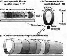Рис. 4. Система координат пространственной информации в заднем мозге позвоночных, устанавливаемая в два этапа. (А) Сначала определяется рострокаудальная позиция, например по экспрессии гена Hox. (В) После этого дорзовентральная позиция определяется градиентами сигналов средней линии, такими как Sonic Hedgehog и BMP 4/7. (С) Результирующая двумерная система координат пространственной информации ограничивает возможный репертуар клеточной дифференцировки плюрипотентных клеток-предшественников.