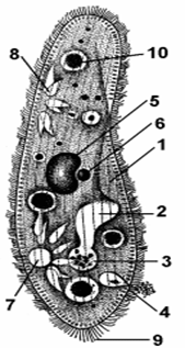 Форма тела постоянная благодаря плотной пелликуле. Органоиды движения реснички (9). Другой важный признак - наличие двух качественно различных ядер: крупного полиплоидного вегетативного ядра - макронуклеуса (5) и мелкого диплоидного - генеративного ядра - микронуклеуса (6). Захват пищи осуществляется с помощью цитостома (клеточного рта) (1) и цитофаринкса (клеточной глотки) (2), глотка открывается непосредственно в эндоплазму. Переваривание пищи происходит в пищеварительных вакуолях (3, 10), а не переваренные остатки выбрасываются через порошицу (4), содержимое сократительных вакуолей (7, 8) изливается через выделительные поры. В эктоплазме многих инфузорий находятся особые защитные приспособления - трихоцисты. При раздражении животного они выстреливают длинную упругую нить, парализующую добычу. При неблагоприятных условиях способны к инцистированию.