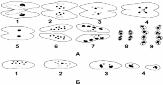 1. Две инфузории соединяются друг с другом околоротовыми областями, в этом месте происходит разрушение пелликулы, и образуется цитоплазматический мостик, соединяющий обе инфузории. 2. Макронуклеусы разрушаются, микронуклеусы претерпевают мейотическое деление, образуются четыре гаплоидных ядра. Три ядра разрушаются, чВ это время в каждой инфузории по два гаплоидных ядра, одно женское, стационарное, ядро остается на месте, второе, мужское, мигрирует по цитоплазматическому мостику в другую инфузорию. 3. Происходит слияние мужских и женских ядер. После этого инфузории расходятся. Конъюгация продолжается несколько часов. 4. Диплоидное ядро претерпевает три митотических деления, в результате образуется 8 диплоидный ядер, из которых 4 становятся микронуклеусами, 4 - макронуклеусами. Три микронуклеуса разрушаются, образуется инфузория с 5 ядрами: 1 - микронуклеус (диплоидный), 4 - макронуклеусы, тоже диплоидный. 5. Каждый из эксконъюгантов делится, причем происходит митотическое деление генеративного ядра, а макронуклеусы расходятся попарно в дочерние инфузории. Образуется 4 инфузории с одним генеративным ядром и двумя макронуклеусами. 6. Каждая из этих четырех инфузорий делится, причем происходит митотическое деление генеративного ядра, а макронуклеусы расходятся в дочерние инфузории. Образуется 8 инфузорий, в каждой из которых один макронуклеус и один микронуклеус. Макронуклеус становится полиплоидный, микронуклеус остается диплоидный. Таким образом, в конъюгации принимали участие две особи, размножение закончилось образованием восьми особей. При длительном бесполом размножении, в результате амитотического деления макронуклеуса, наступает "депрессия", чтобы восстановить нормальный набор хромосом происходит аутогамия. 1. Сначала происходит разрушение макронуклеуса, микронуклеус делится с образованием восьми гаплоидных ядер, из которых шесть разрушаются. 2. Происходит слияние двух ядер, образуется диплоидный синкариона. 3. Происходит деление синкариона, два ядра становятся микронуклеусами, два - макронуклеусами. 4. Происходит деление инфузории, образуются две особи с нормальными микронуклеусами и макронуклеусами. Представители: - инфузория туфелька, инфузория - трубач, инфузория-дидиниум, сдвойки. У человека в толстом кишечнике может паразитировать инфузория балантидий, вызывает тяжелое заболевание - балантидиаз. Заболевание проявляется в колитах (болях в кишечнике); кровавом стуле, лихорадочном состоянии. Основным источником заражения являются свиньи, зараженные балантидиями. Заражение происходит на стадии цист.