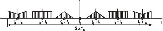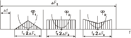 где zkFвk=2ΔFk – полоса частот, занимаемая k-ым канальным сигналом; zk – коэффициент, определяемый способом модуляции поднесущей сообщением λk, спектр которого имеет полосу Fвk; Z – коэффициент, определяемый способом модуляции поднесущей групповым сигналом; δƒk – защитный интервал между соседними спектрами; Δƒ – нижняя граничная частота спектра многоканального сообщения.