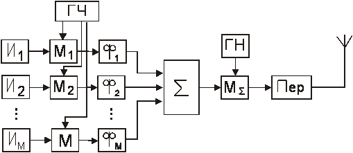Для формирования канальных сигналов с неперекрывающимися спектрами осуществляется перенос спектров сообщений с помощью канальных модуляторов (Мi). На каждый модулятор подаются сообщение λk(t) и колебание sk(t)=akcos(ωkt + φk) от генератора поднесущих частот (ГЧ) (рис. 2.1.2). Канальные сигналы подаются на фильтры, полосы которых согласованы со спектрами этих сигналов. Фильтры подавляют гармоники, образующиеся в канальных модуляторах. В суммирующем устройстве складываются канальные сигналы, и групповой сигнал, спектр которого показан на рис. 2.1.1,б, модулирует несущую, вырабатываемую генератором (ГН). На выходе модулятора МΣ образуется радиосигнал с несущей ω0.
