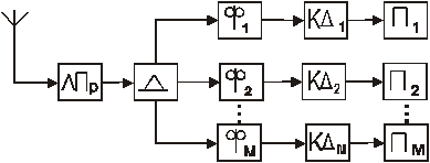 На приемной стороне после усиления и преобразования сигнала в ЛПр производится выделение группового сигнала с помощью демодулятора (Д). Групповой сигнал подается на устройство разделения, состоящее из параллельно включенных фильтров Ф1, Ф2,…, ФМ. На рис. 2.1.1,б параболами обозначены характеристики затухания фильтров. На выходе каждого фильтра выделяется соответствующий канальный сигнал вместе с продуктами взаимных помех и шумами. Канальные демодуляторы (КДi) выделяют переданные сообщения, направляемые далее получателям Пi.